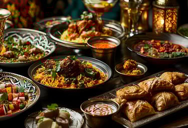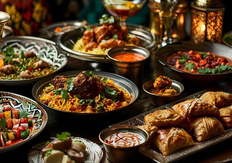 A vibrant platter showcasing colorful Indian biryani, aromatic Arabic kebabs, and flavorful Pakistani curries.