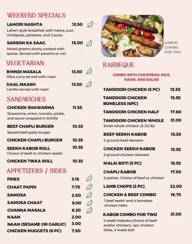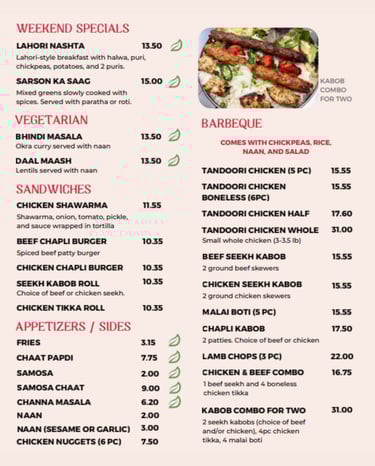 Savor the rich tastes of Indian, Pakistani, and Arabic dishes crafted with care.